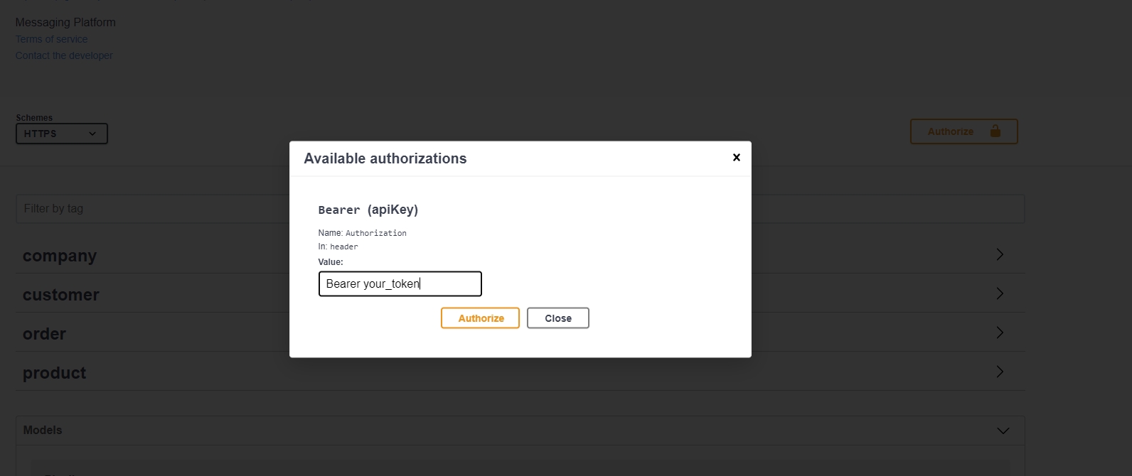 Sau khi truy cập trang API documentation -> Nhấn vào nút Authorize -> Nhập vào Bearer <company_token_của_bạn> -> Authorize